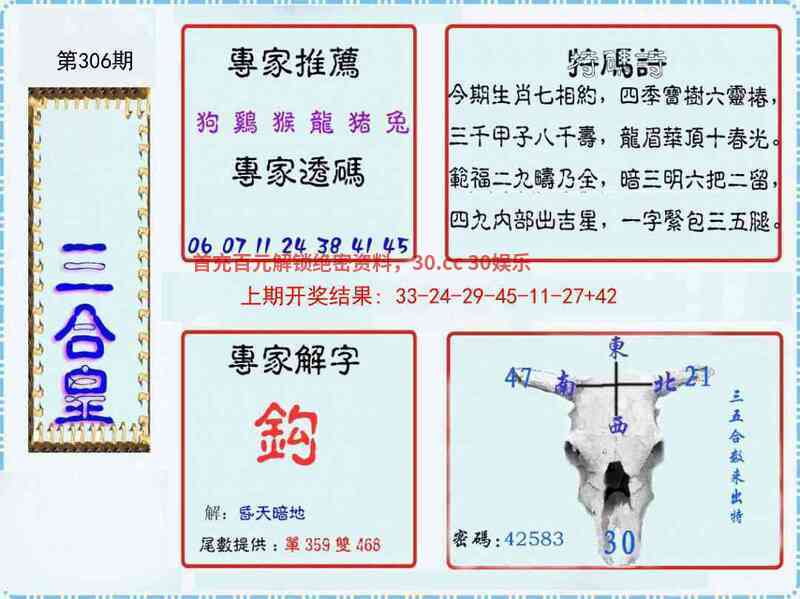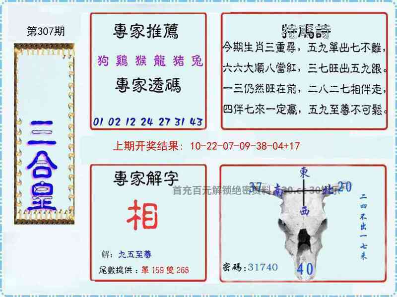 307期特码诗:今期生肖三重尋,五九單出七不離,六六大順八當紅,三七旺出五九跟。一三仍然旺在前,二八二七相伴走,四伴七來一定赢,五九至尊不可鬆。