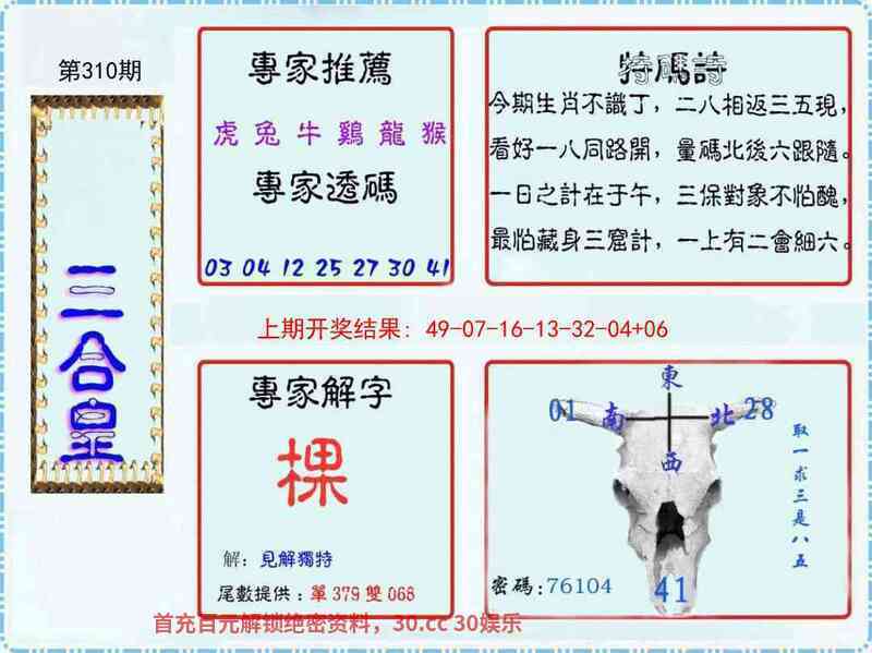 310期特码诗:今期生肖不識丁,二八相返三五現,看好一八同路開,量碼北後六跟隨。一日之計在于午,三保對象不怕醜,最怕藏身三窟計,一上有二會細六。